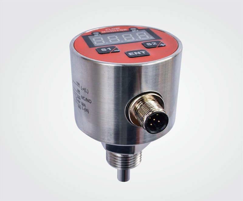 基于惹事原理,在封闭的探头内包含两个电阻,其中一个被加热作为探测电阻,另一个未被加热作为基准电阻,当介质流动时,加热电阻上的热量被带走。电阻值被改变。两个电阻差值被用作判断流速的依据。数字显示流速,无活动部件,免维护,安装方便,一种型号适用多种管径要求。开关量连续可调,极低的压力损失,结构紧凑。LED显示状态,PNP/NPN输出可设定,可用于气动和液压系统,可用于循环水、切削液及润滑的断流检测,以及泵的空转保护。